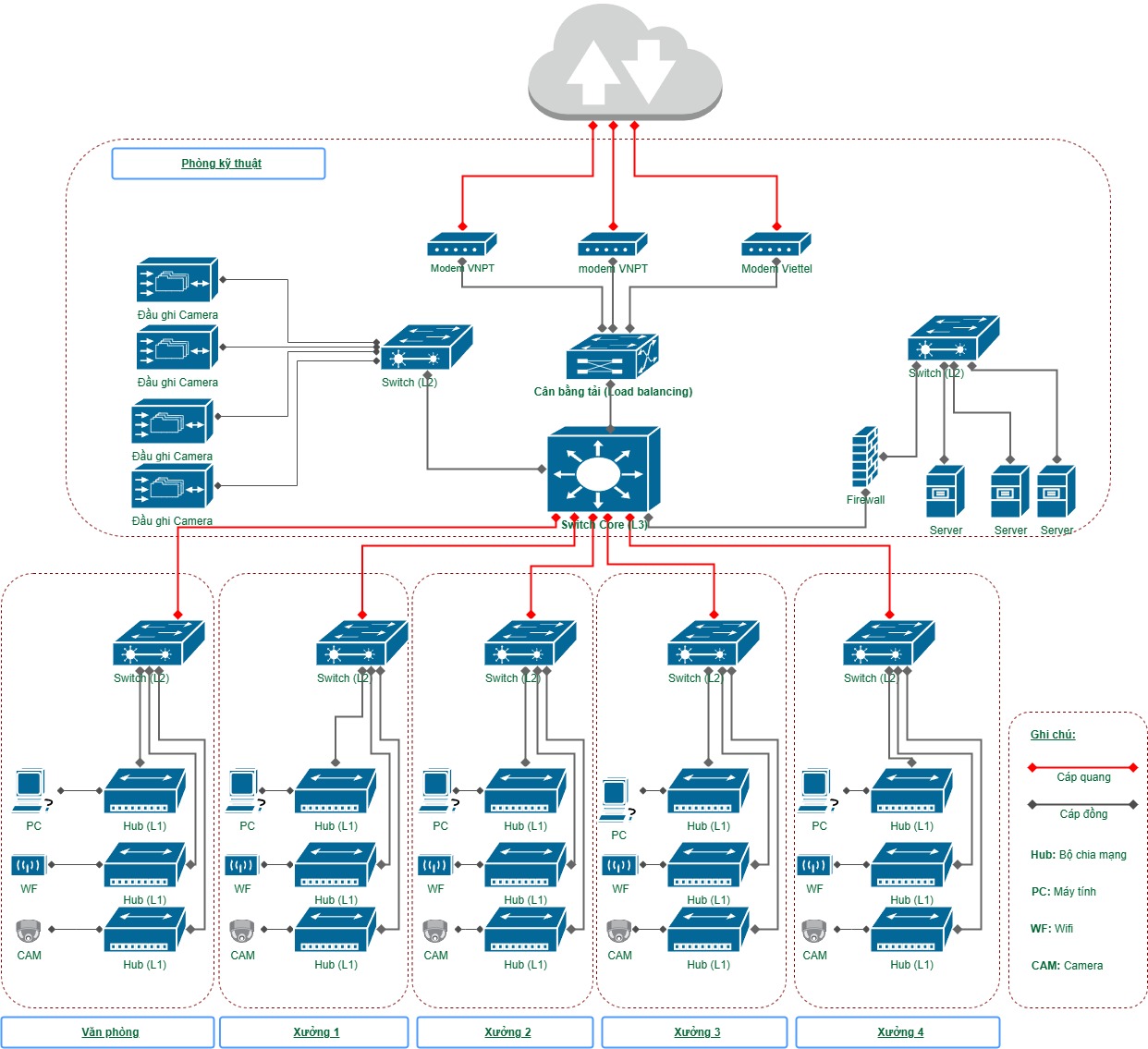Thi công hệ thống mạng WAN (Wide Area Network) là quá trình khảo sát, thiết kế, triển khai, cấu hình và vận hành hệ thống mạng diện rộng nhằm kết nối nhiều mạng LAN tại các địa điểm khác nhau (chi nhánh, showroom, văn phòng…) thành một hệ thống thống nhất, cho phép trao đổi dữ liệu từ xa một cách ổn định và bảo mật.